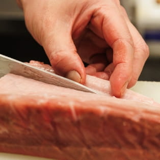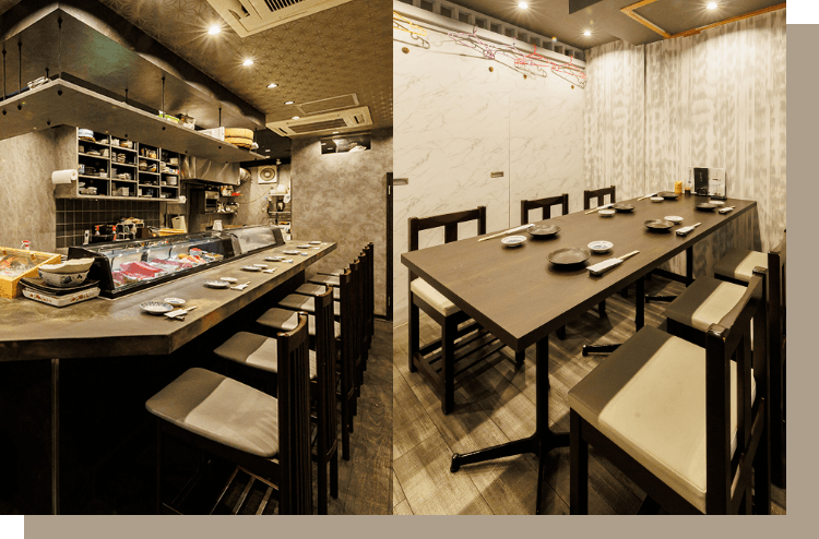 肥後橋駅近くの好立地にある当店。店内は、カウンター10席、テーブル26席、完全個室1室を完備。カウンターでは職人の手仕事を目の前で愉しめ、テーブル席ではご家族やご友人とゆったりお過ごしいただけます。最大6名様までの個室は、接待やプライベートな会食にもおすすめ。カジュアルで居心地のよい空間は、女性おひとりでも立ち寄りやすく、英語メニューもご用意しておりますので海外ゲストのご案内もスムーズです。